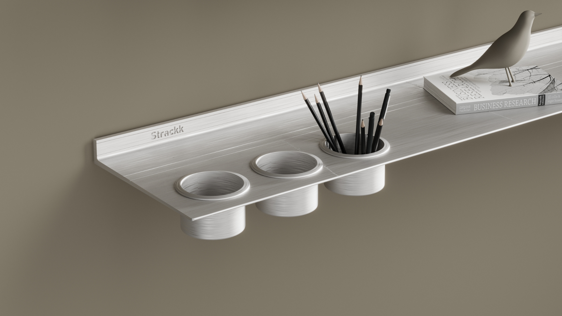 The Wall Shelf Bathroom Off-white is a floating wall shelf with three cut-outs for storage cups. Handy for your toothbrush, soap and other toiletries. The price includes three aluminum storage cups in the same color as your shelf. The aluminum cups supplied differ from the wooden cups shown in the images. During the ordering process you can indicate whether you want the three cut-outs on the left or right side of your shelf.