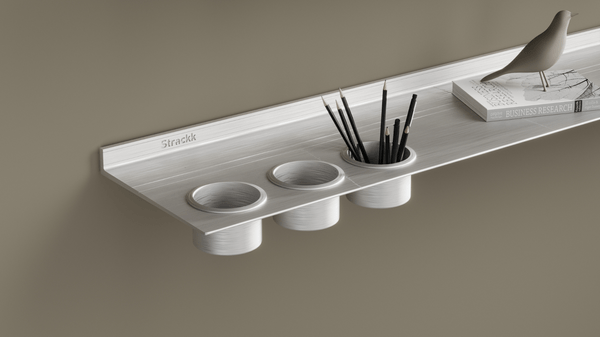 The floating shelf is made of 75% recycled aluminum and is scratch-free and water-resistant coated in Off-white color. Aluminum does not rust. The 2 supplied strips are made of metal. If you are hanging the shelf in a wet area, we provide the metal strips with an extra coating so that they too will not rust. Mail after your order to info@strackk.com, mention your order number and indicate that you want to hang your shelf in a wet room. Then we will arrange the extra layer for you.