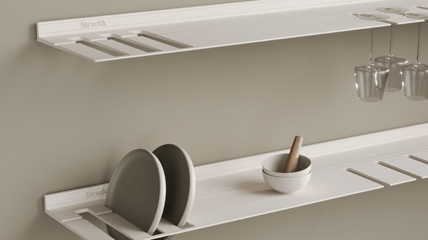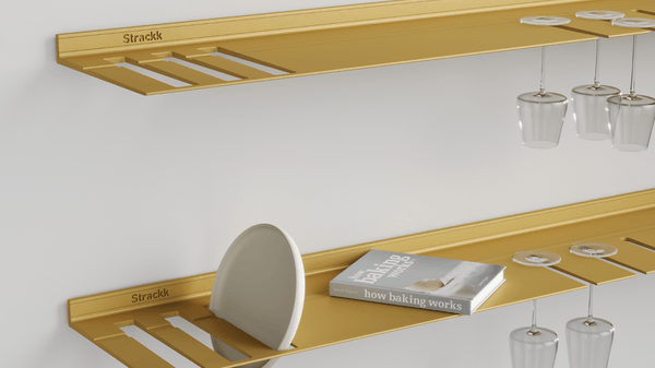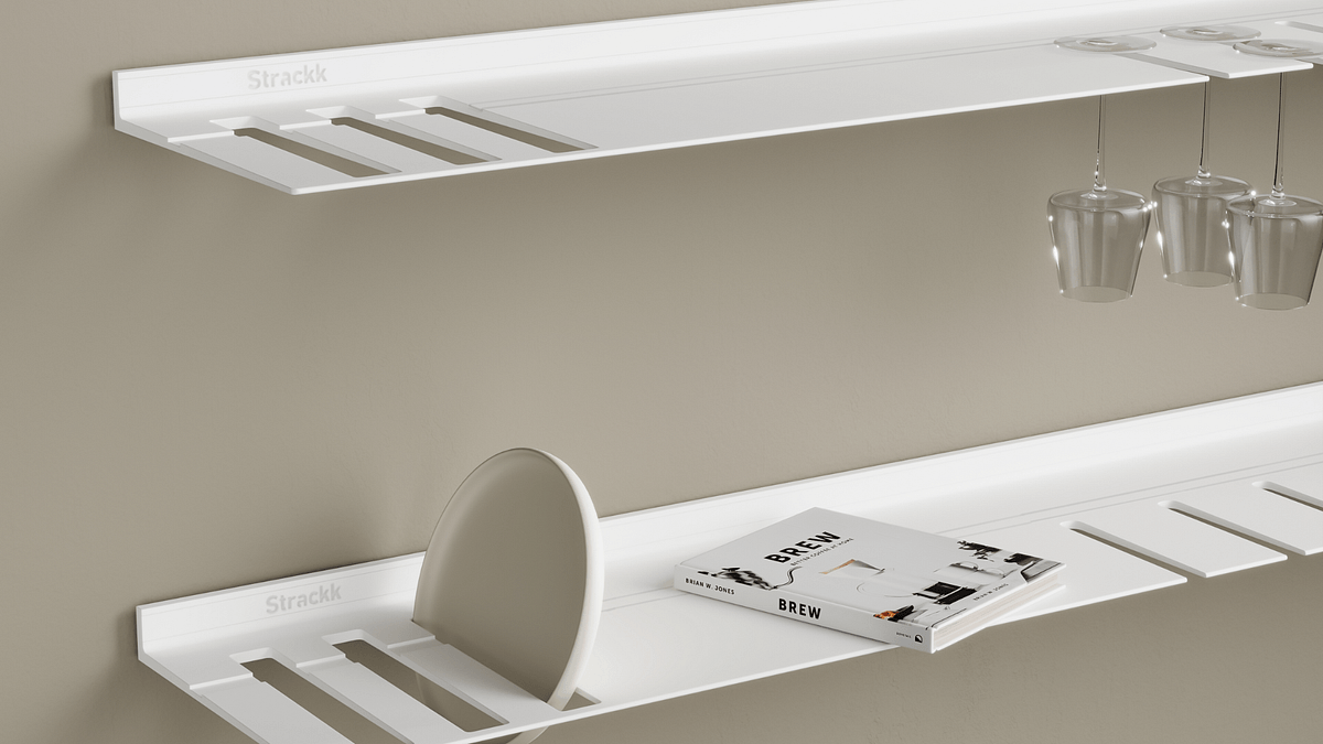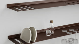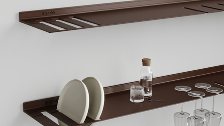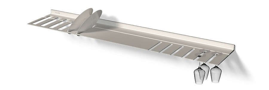 The wall shelf with plate and wine glass rack is ideal for the kitchen or living room. So you always have your wine glasses and plates to hand. The floating shelf is made from one piece of recycled metal so that the shelf is extremely strong and lasts forever. You can present your most beautiful and heaviest items on the shelf as it can carry a weight of up to 250 kilograms per meter. For extra atmosphere you can add lighting all around in the order menu. That lighting is dimmable from work to mood light.