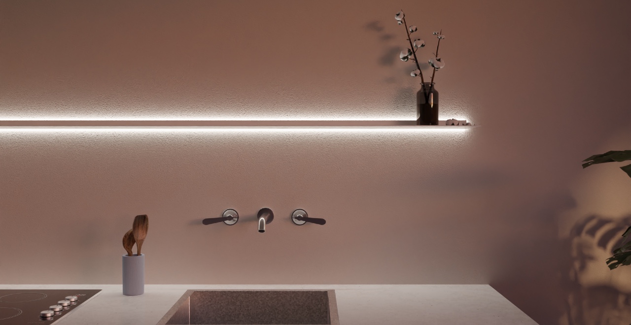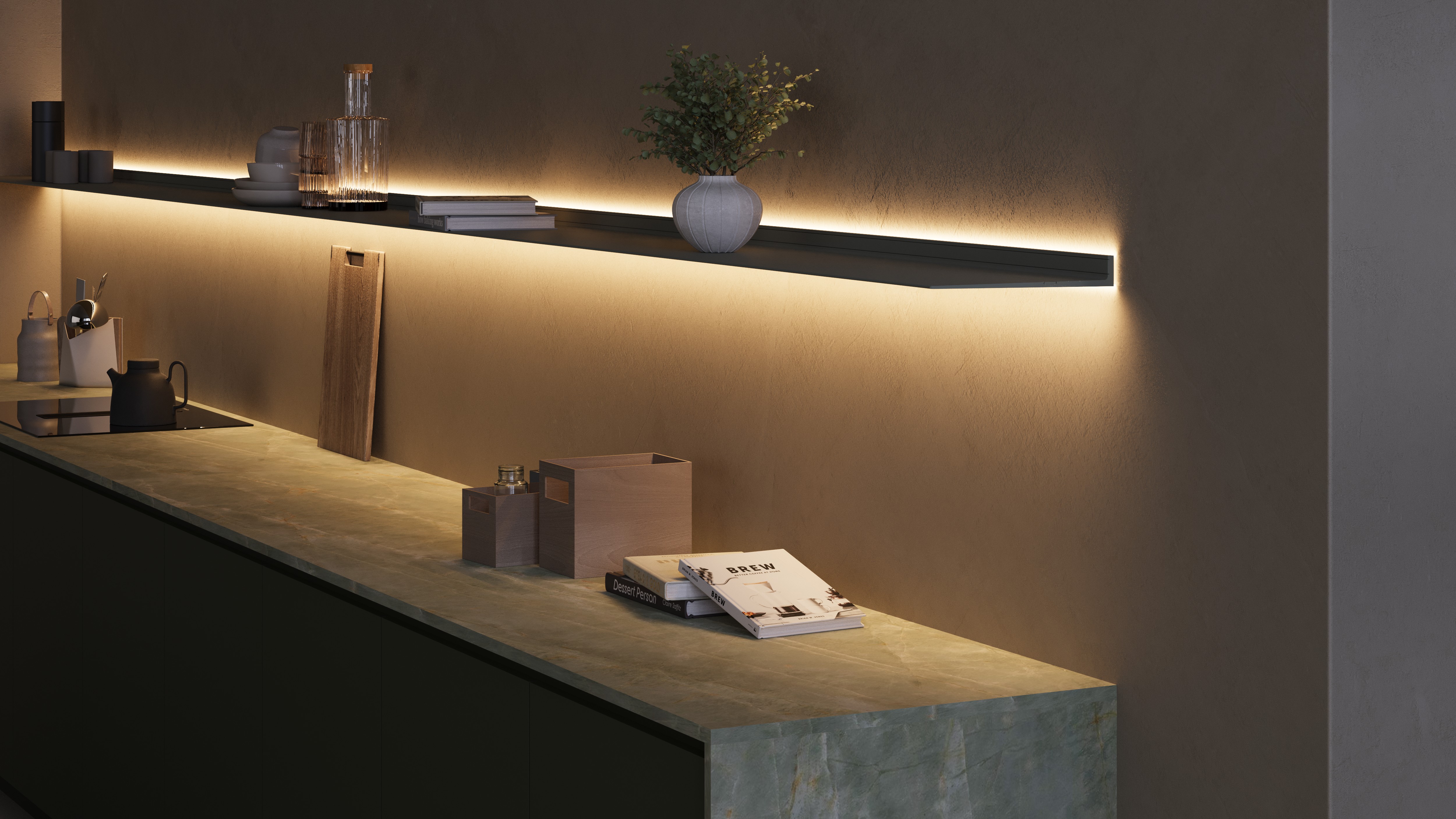 The wall shelves with surrounding lighting are available in Black or any other color from the 127 colors with a finish in matte fine structure or satin gloss. The shelf floats on the wall thanks to the invisible mounting system. Made from extremely durable recycled aluminum that will last for generations. A floating wall shelf from Strackk can be mounted on any flat wall at least 12mm thick. The wall can be made of plaster, concrete, wood, hollow partition wall, panel, iton, or anything else.