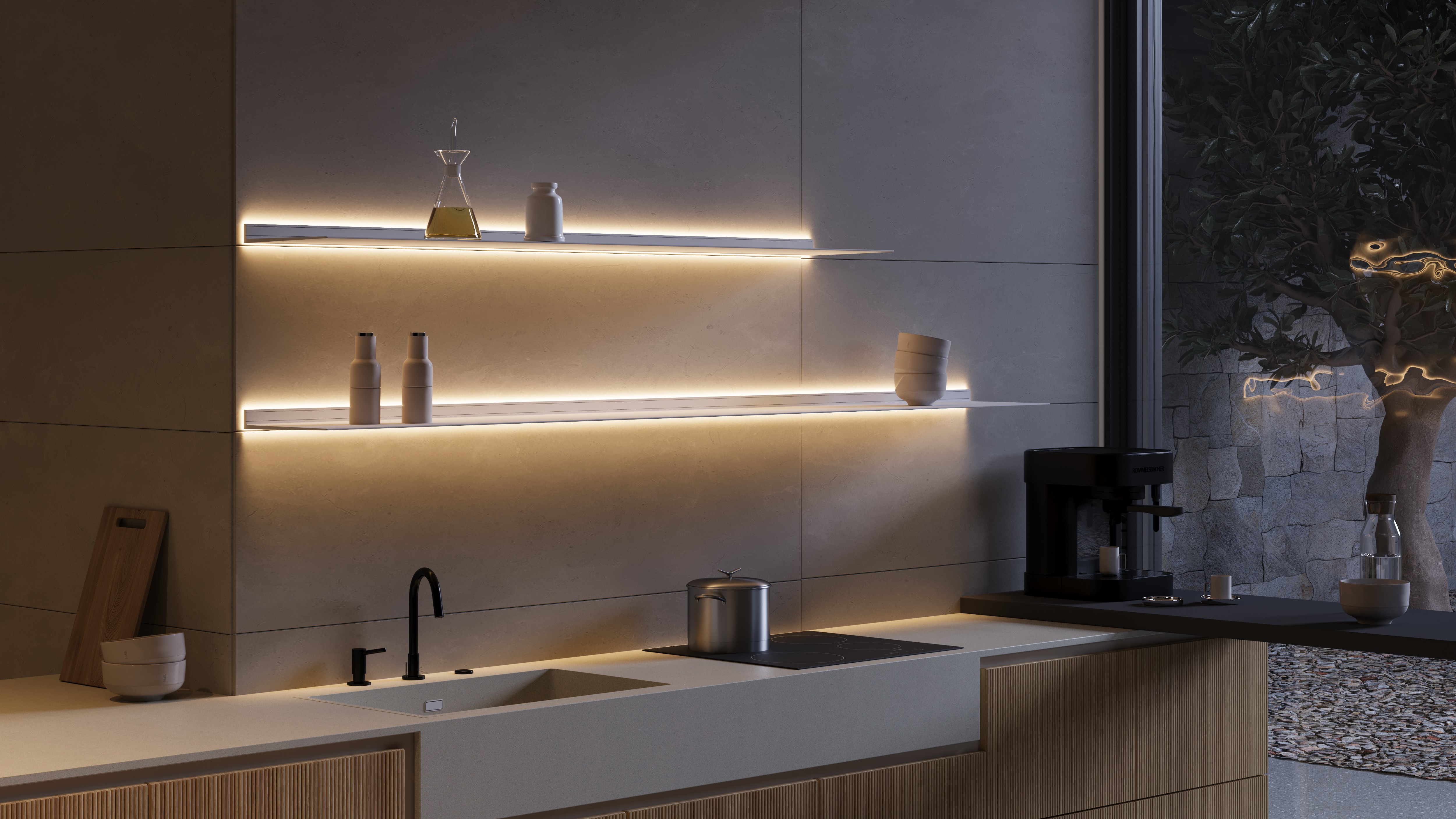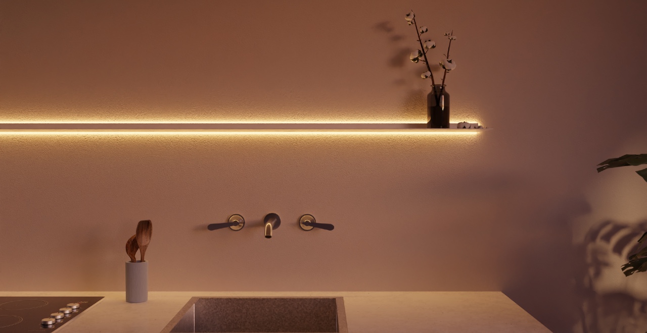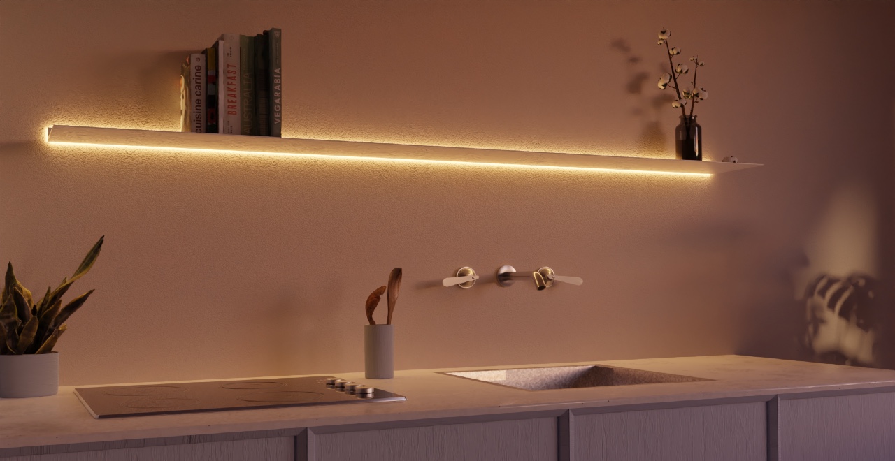This wall shelf with lighting features illumination around the shelf on the wall side. The diffuse light at the back of the shelf creates ambiance and subtly highlights the items on the shelf. The wall shelf is moisture resistant and rustproof. The light intensity is dimmable, and the color can be adjusted from cool work light to warm ambient light with the included remote control. Surrounding lighting is possible with 22 and 29.5 cm deep shelves.