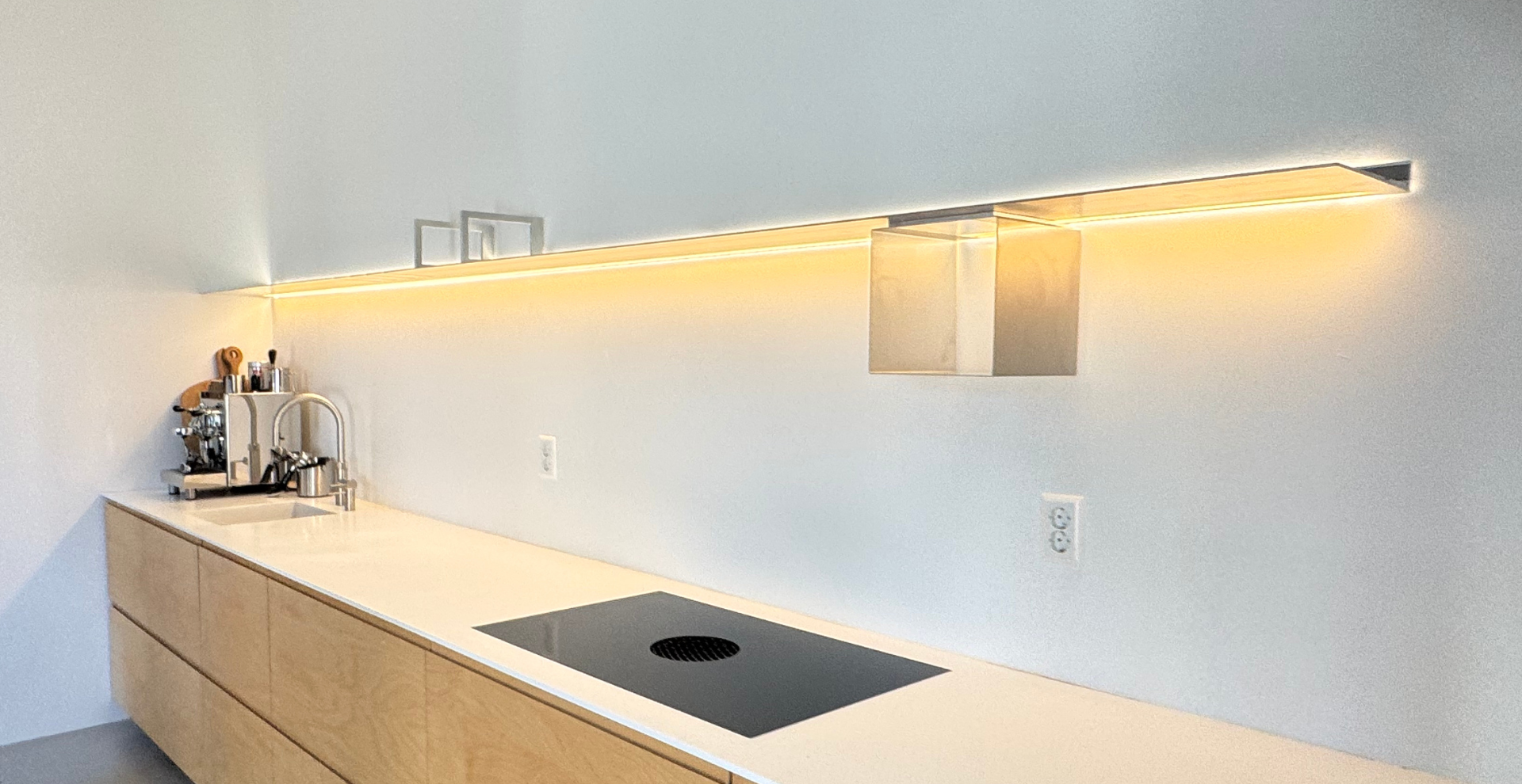 - Integrated lighting: LED lighting under the shelf provides subtle, ambient lighting that accentuates your displayed items without being overwhelming. Or turn the lights brighter and to whiter for work light above your kitchen countertop or desk.
