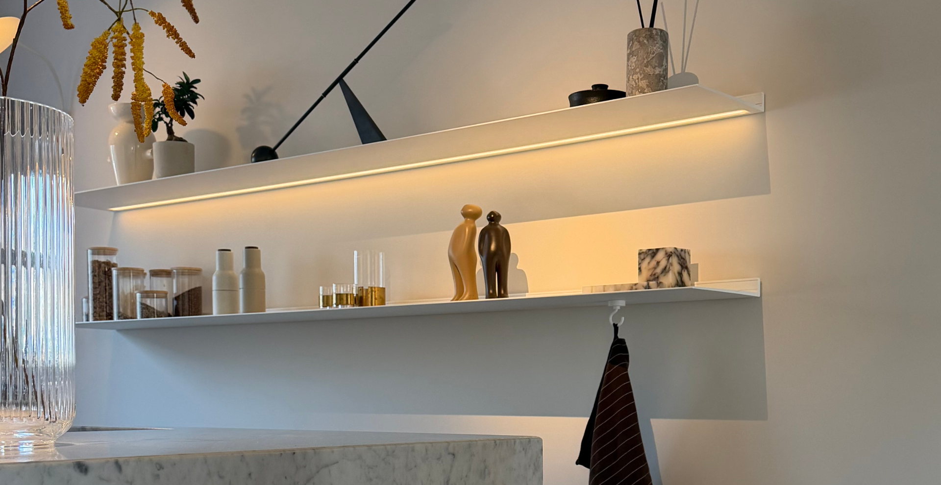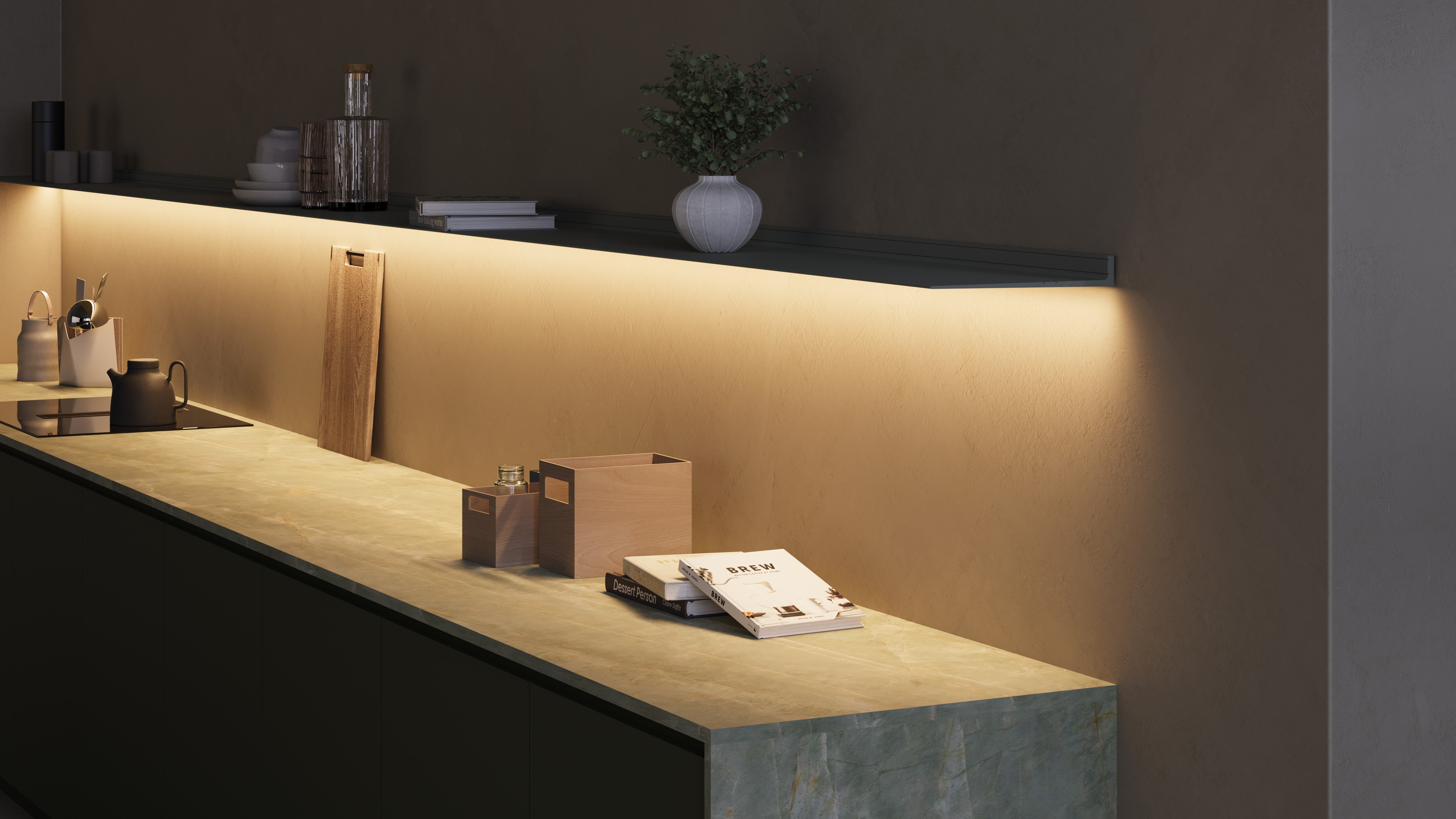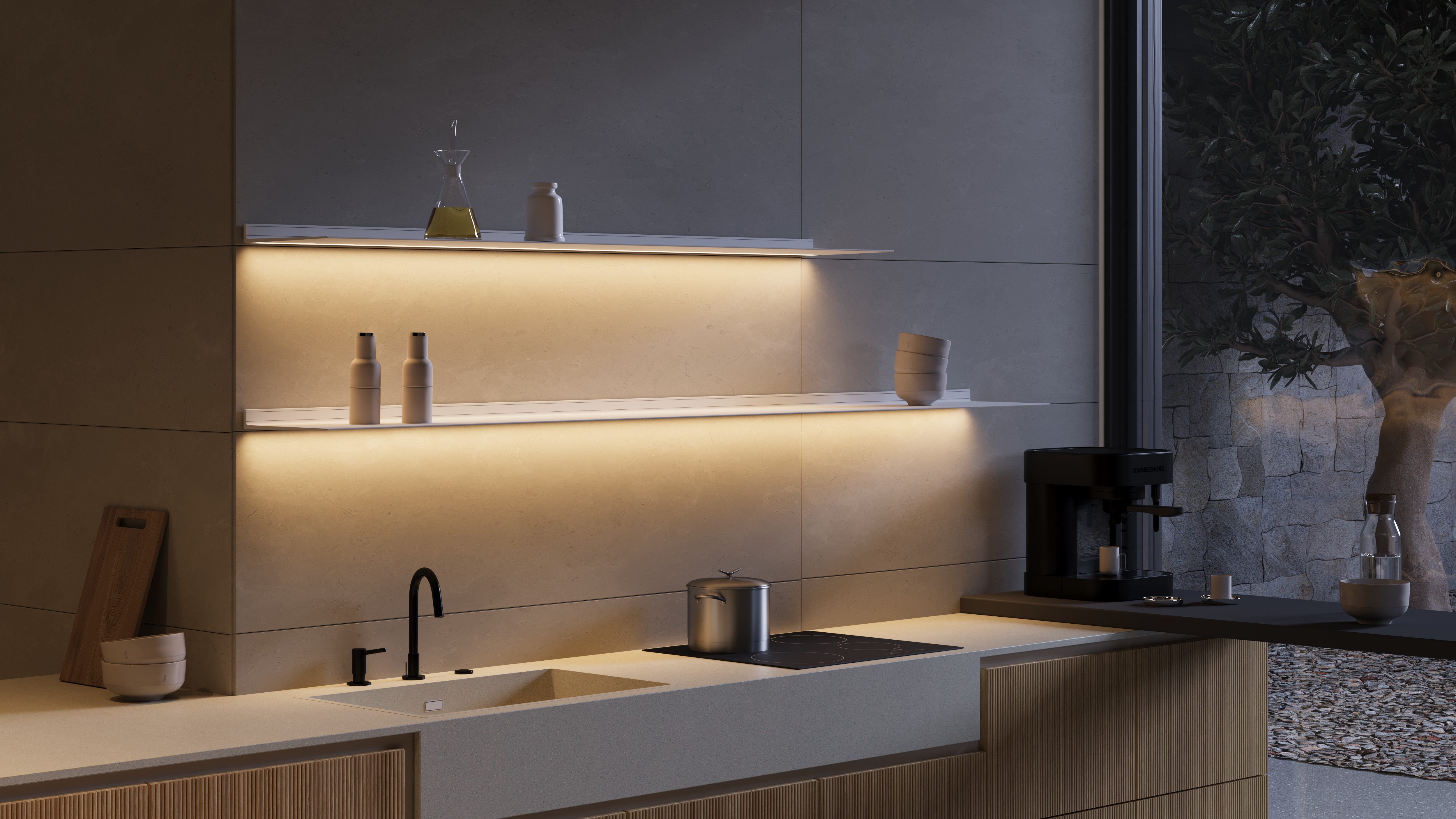 - Éclairage intégré : l'éclairage LED sous l'étagère fournit un éclairage d'ambiance subtil qui met en valeur les objets exposés sans les écraser. L'éclairage peut également être plus intense et plus blanc pour éclairer le plan de travail au-dessus de l'évier de la cuisine ou du bureau.