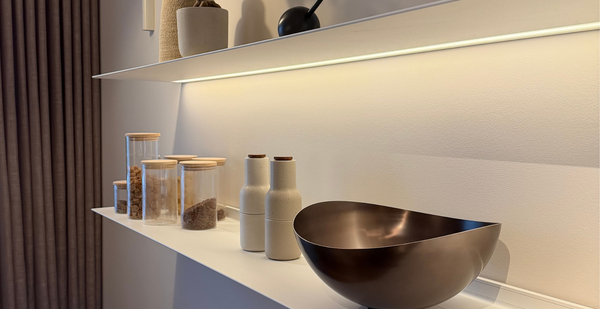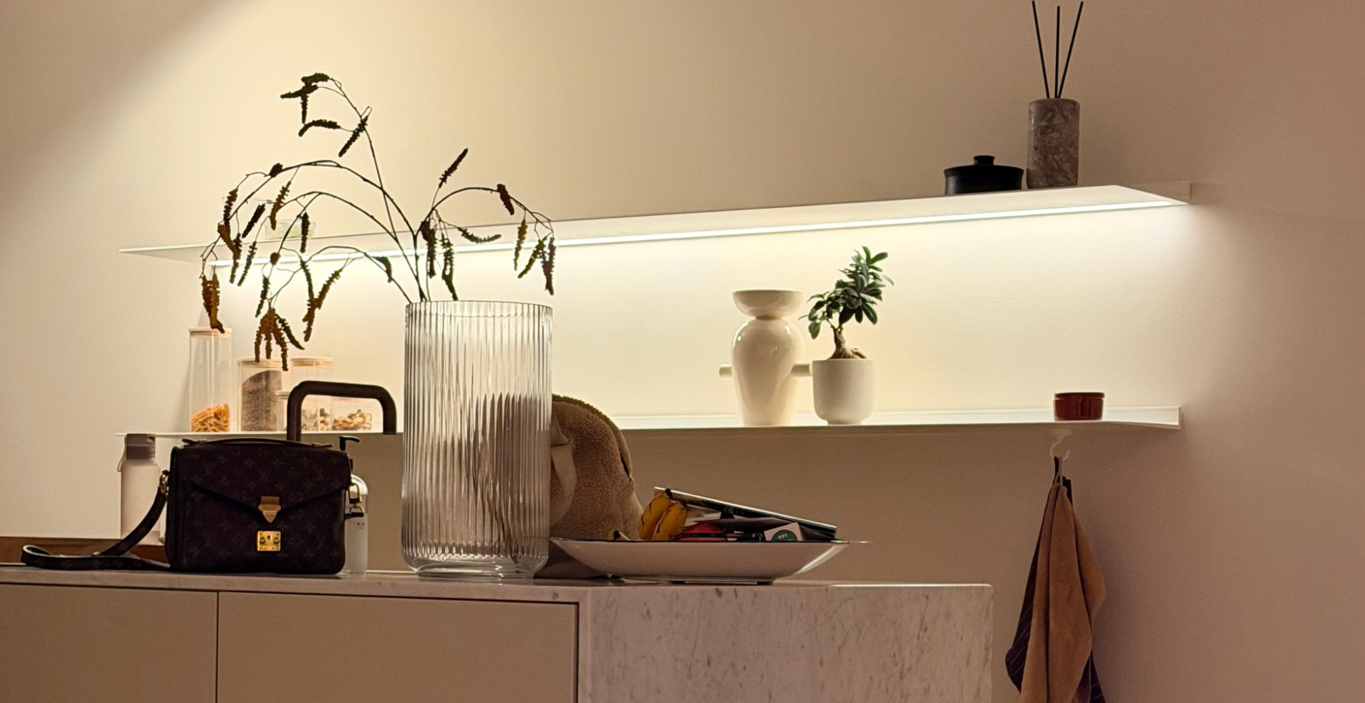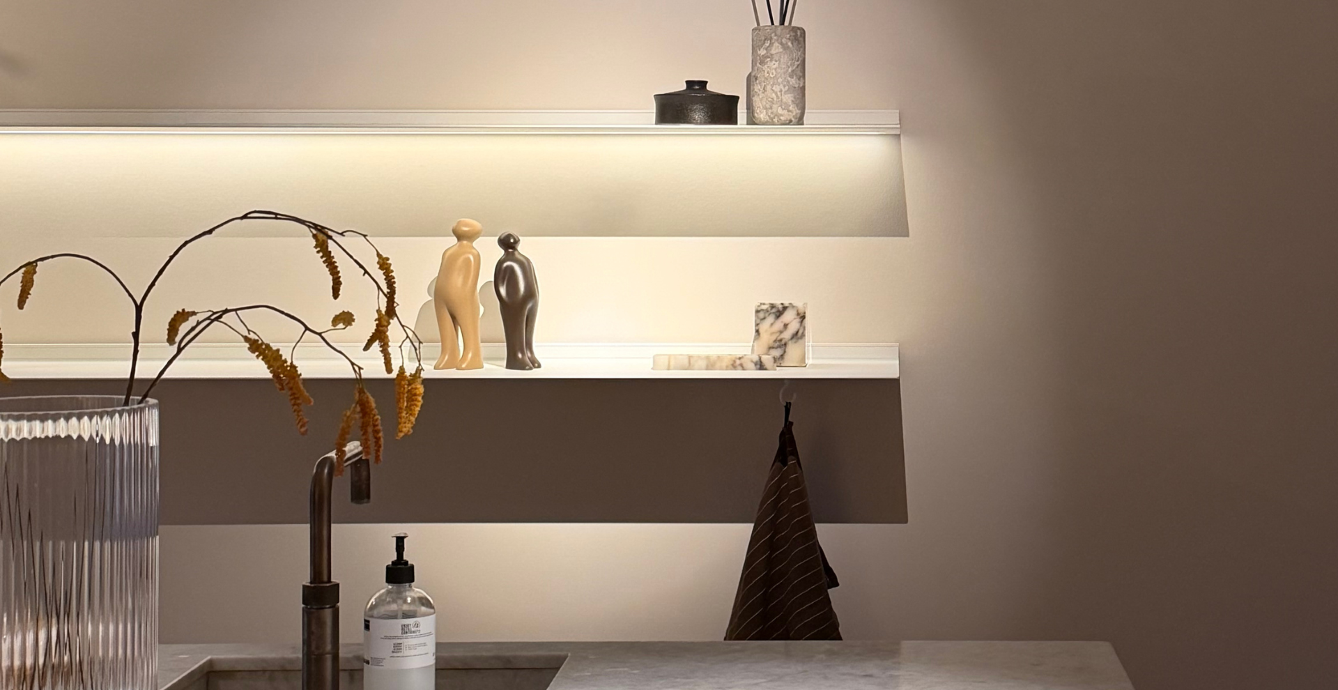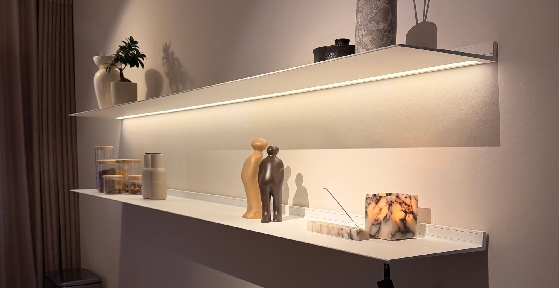 - Éclairage intégré : l'éclairage LED sous l'étagère fournit un éclairage d'ambiance subtil qui met en valeur les objets exposés sans les écraser. L'éclairage peut également être plus intense et plus blanc pour éclairer le plan de travail au-dessus de l'évier de la cuisine ou du bureau.