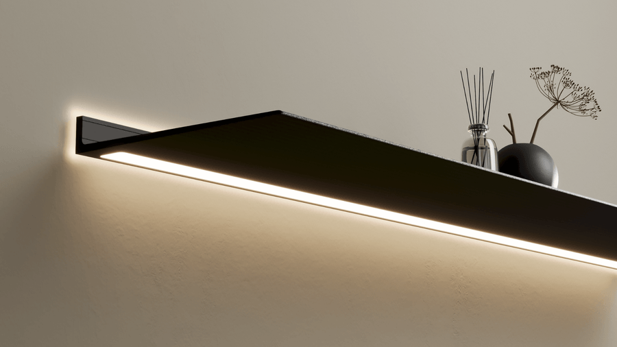 L'étagère murale est résistante à l'humidité et ne rouille pas. L'intensité lumineuse est réglable et la couleur peut être ajustée du blanc au jaune à l'aide de la télécommande fournie. Un sous-éclairage est possible pour les tablettes de 22 et 29,5 cm de profondeur. Chaque étagère est fabriquée sur mesure : dès réception de votre commande, nous nous mettons immédiatement au travail pour fabriquer votre étagère en aluminium brut dans la profondeur, la longueur et la couleur souhaitées. En raison des fêtes de fin d'année, le délai de livraison est de 8 semaines (au lieu de 6). La garantie de remboursement s'applique aux longueurs et couleurs standard. Lisez notre politique de retour. Les frais de port sont gratuits pour les planches jusqu'à 150 cm. Pour les planches plus longues, nous appliquons des frais de port fixes et avantageux.