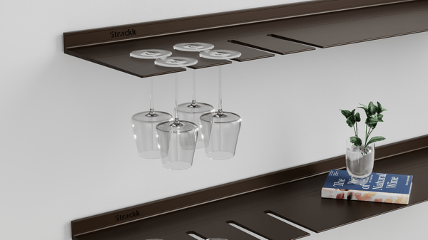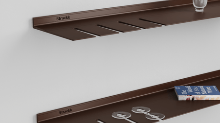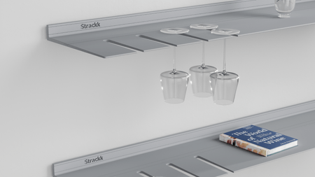 accessoires spécialement conçus pour Strackk, tels que des serre-livres, des crochets magnétiques et des armoires. Si vous placez l'une des deux bandes métalliques fournies dans la rainure, votre étagère devient magnétique. Vous pouvez ensuite clipser les accessoires magnétiques tels que les crochets sous l'étagère au niveau de la rainure avec la bande.