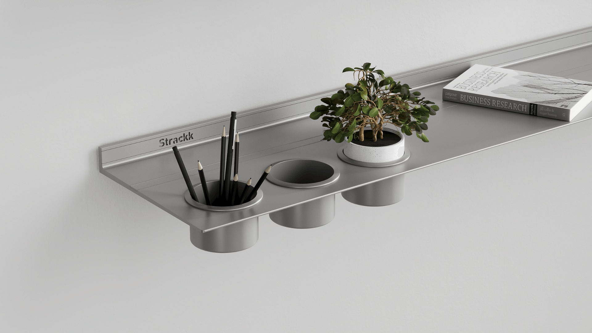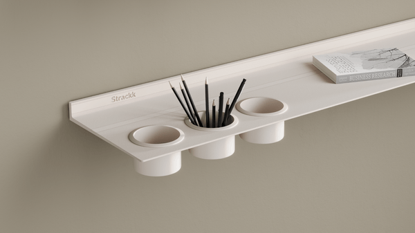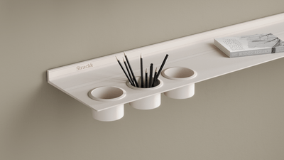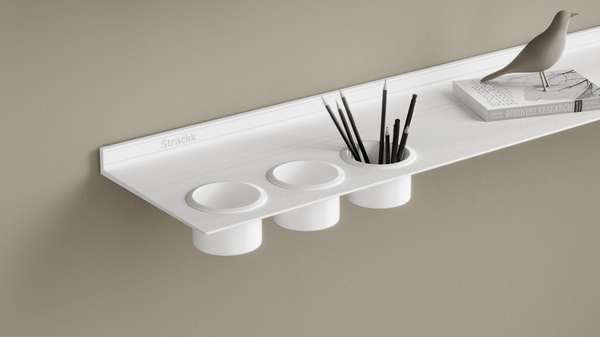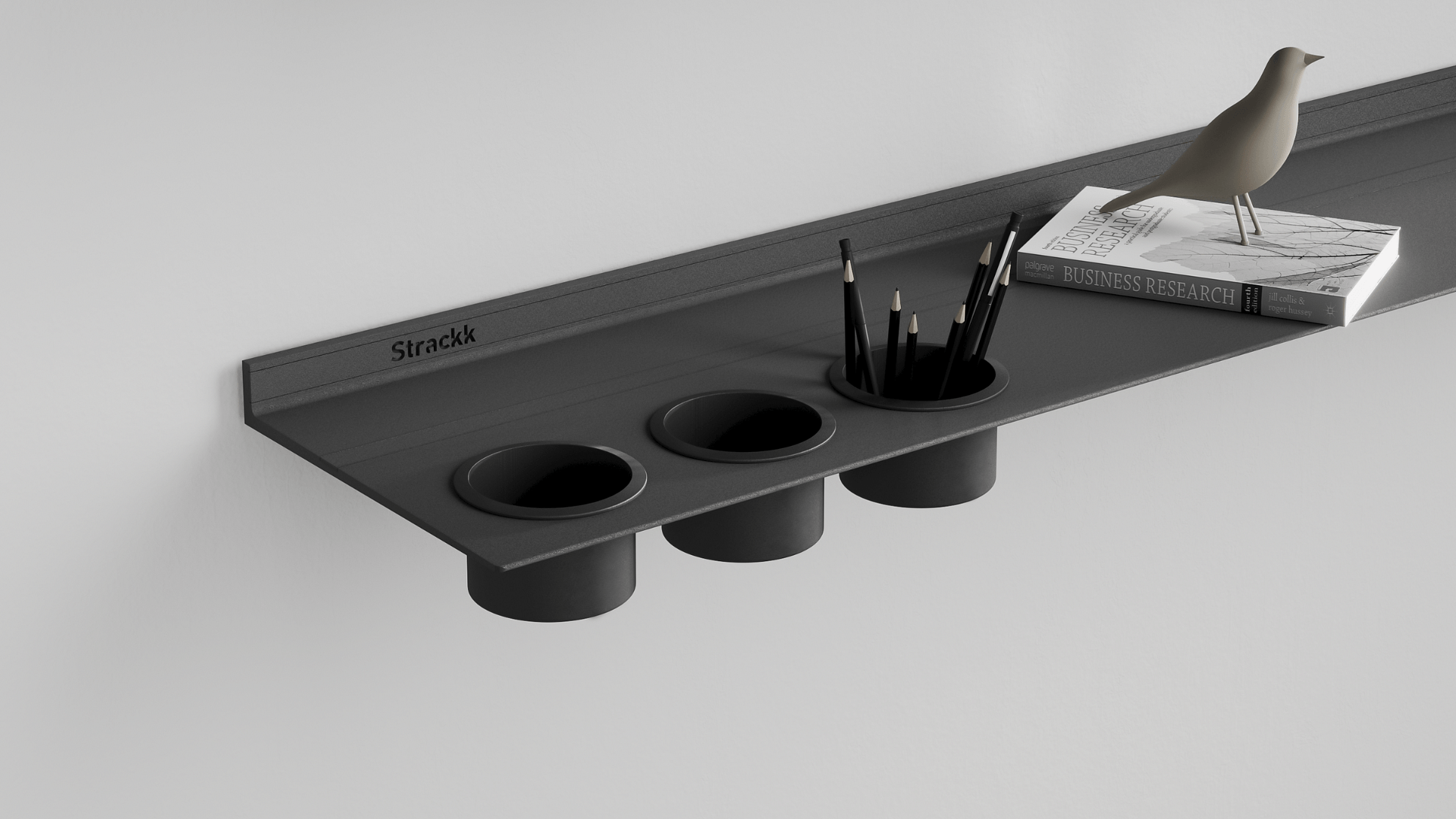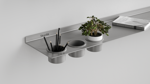 Vous pouvez rendre votre étagère murale flottante encore plus fonctionnelle avec nos accessoires spécialement conçus pour Strackk, tels que des serre-livres, des crochets magnétiques et des armoires. Si vous placez l'une des deux bandes métalliques fournies dans la tablette, votre étagère devient magnétique. Les accessoires magnétiques tels que les crochets peuvent être clipsés sous l'étagère à la hauteur de la bande métallique.