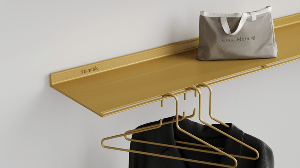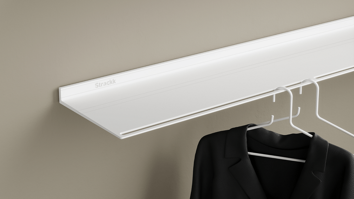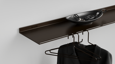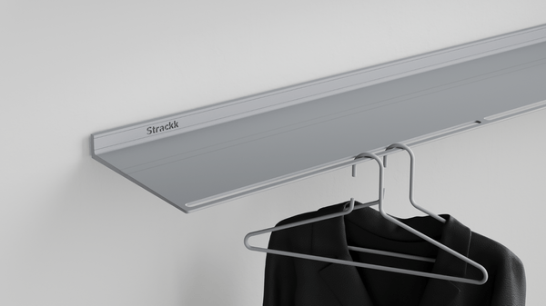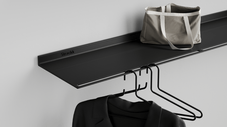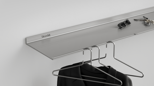 This wall coat rack is a shelf and coat rack in one. The ideal wardrobe for the hall or bedroom. It is a floating wall shelf with slots on the front in which clothes hangers can be hung. The wall coat rack is made from 1 piece of recycled metal, which makes it extremely strong and lasts forever.
