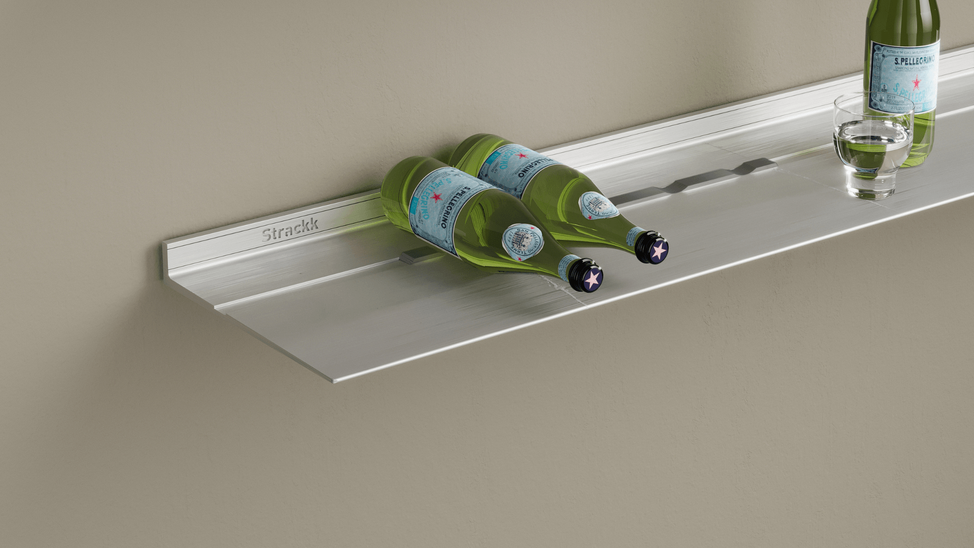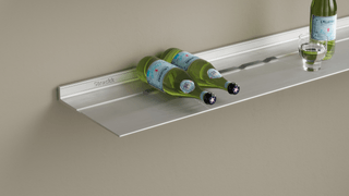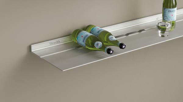 - Schuif de wijnfleshouder voorzichtig in de voorbestemde richel van uw 22 of 29,5cm diepe Strackk plank.