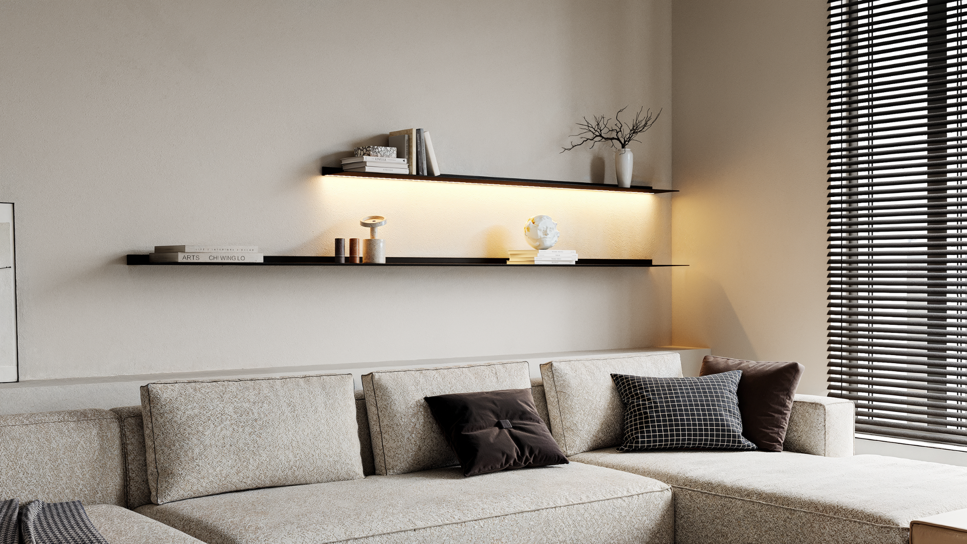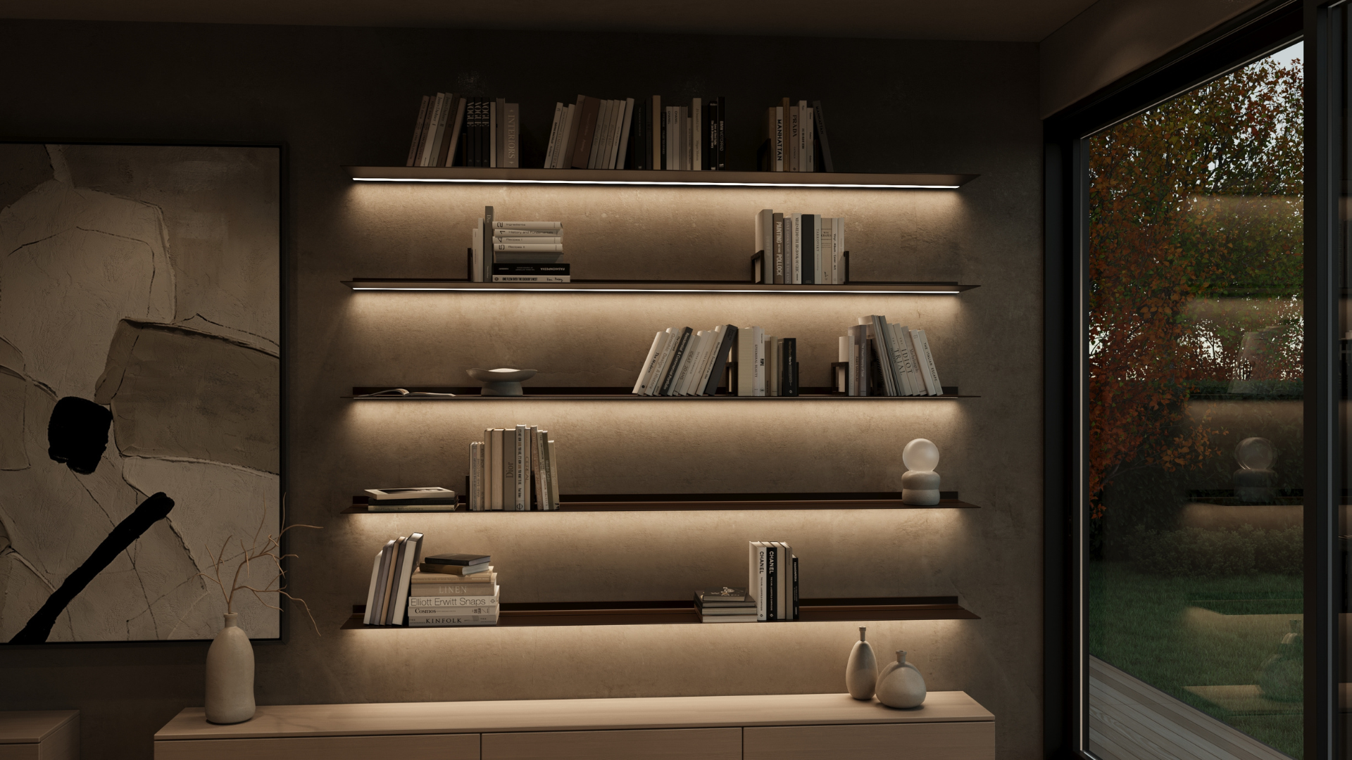 De wandplanken van Strackk zijn verkrijgbaar met geïntegreerde verlichting, zowel functioneel voor het vinden van boeken als sfeervol voor het uitlichten van decoraties. De led-verlichting is naadloos weggewerkt in de plank en zorgt voor mooi diffuus licht wat met de meegeleverde afstandsbediening makkelijk in sterkte te dimmen is als ook in te stellen van warm sfeer - naar koud werklicht.