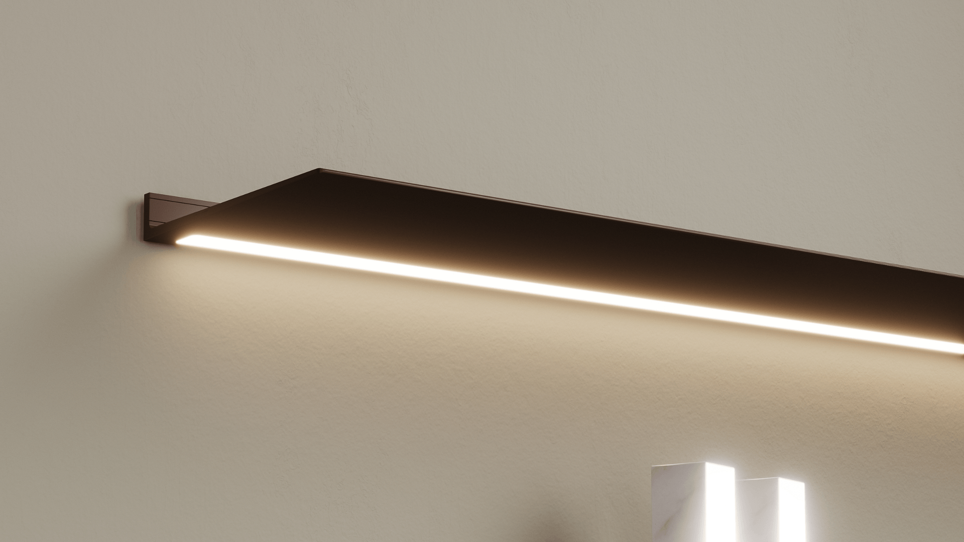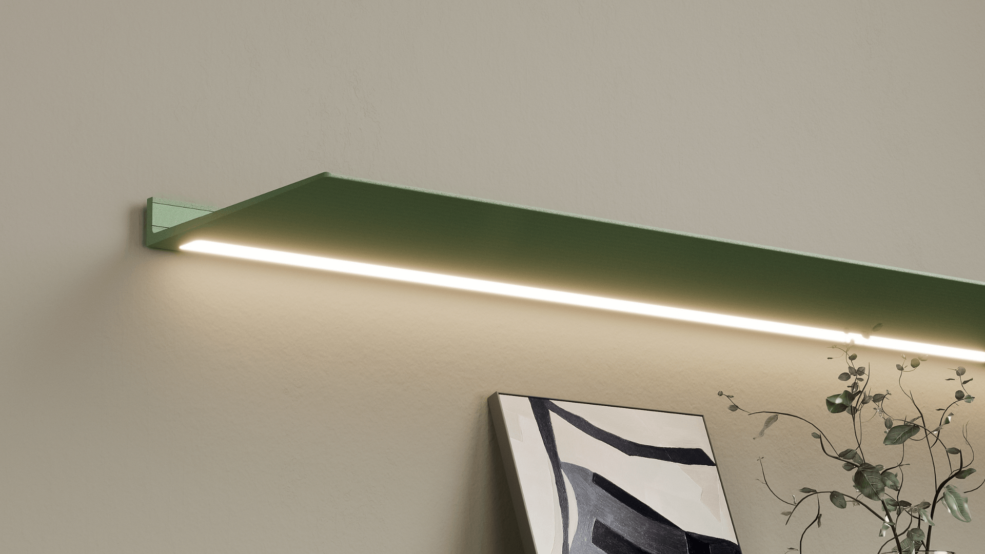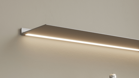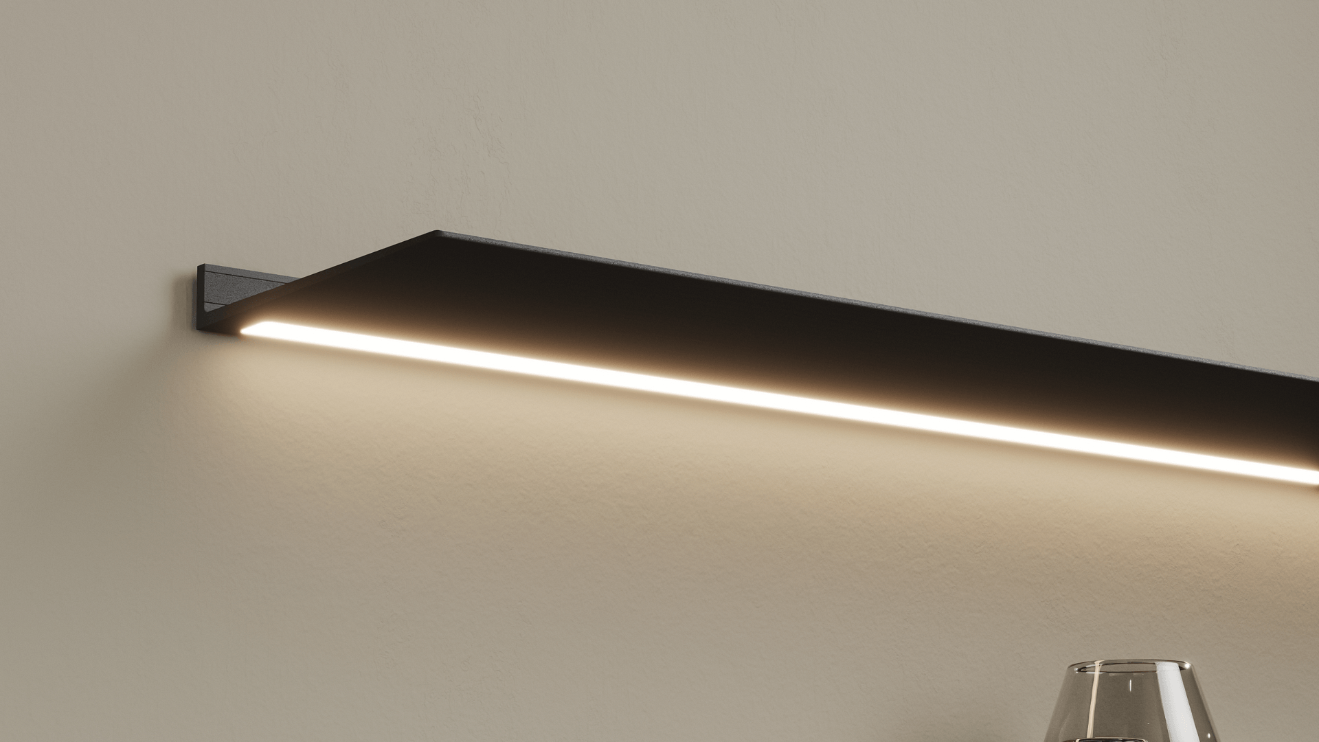- Geïntegreerde verlichting: LED-verlichting onder de plank zorgt voor een subtiele, sfeervolle verlichting die uw uitgestalde items accentueert zonder overweldigend te zijn. Of zet de verlichting feller en naar witter licht voor werklicht boven uw keukenaanrecht of bureau.