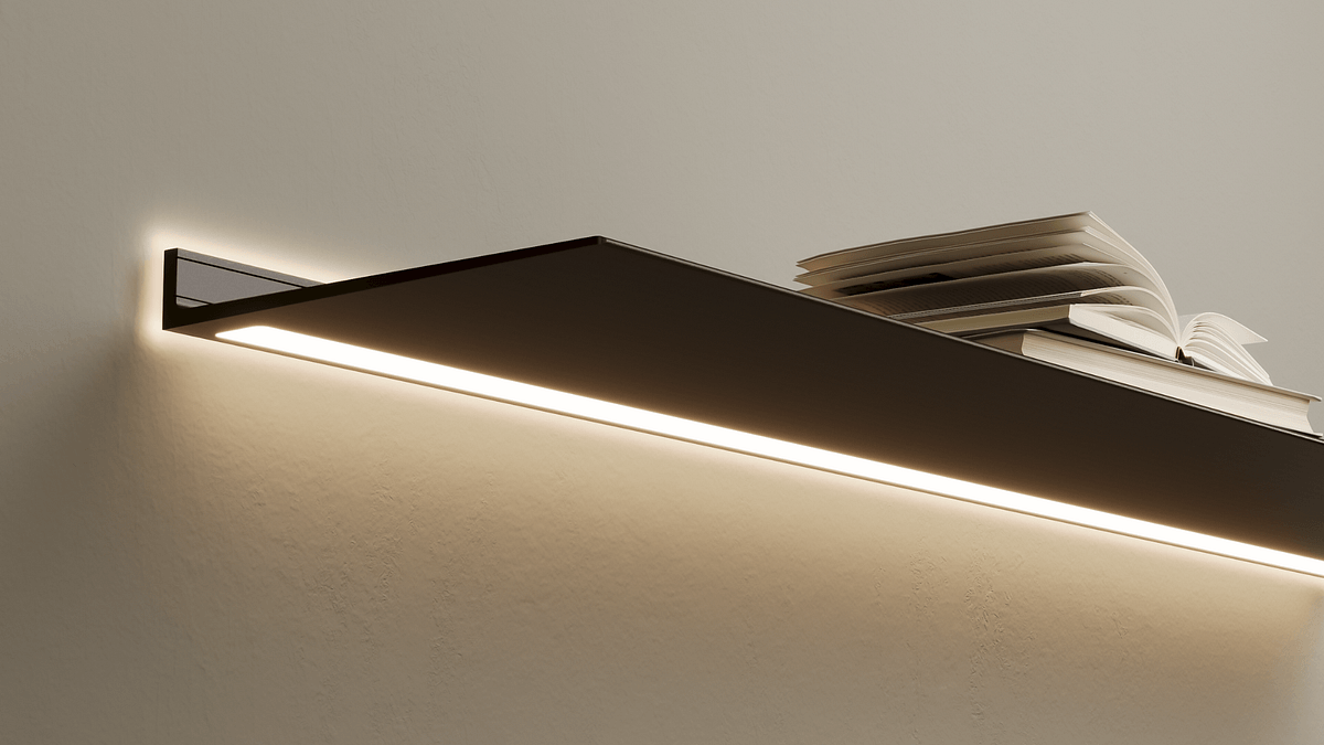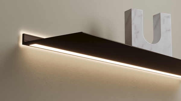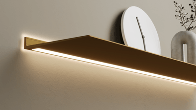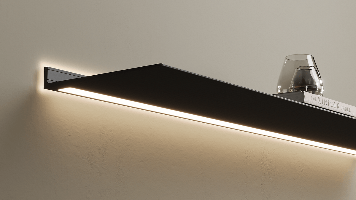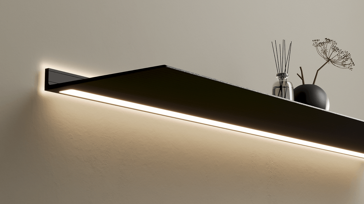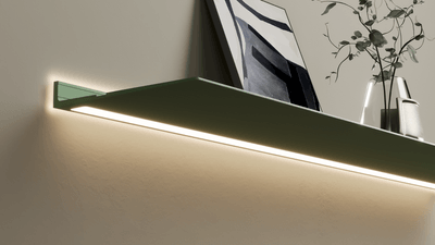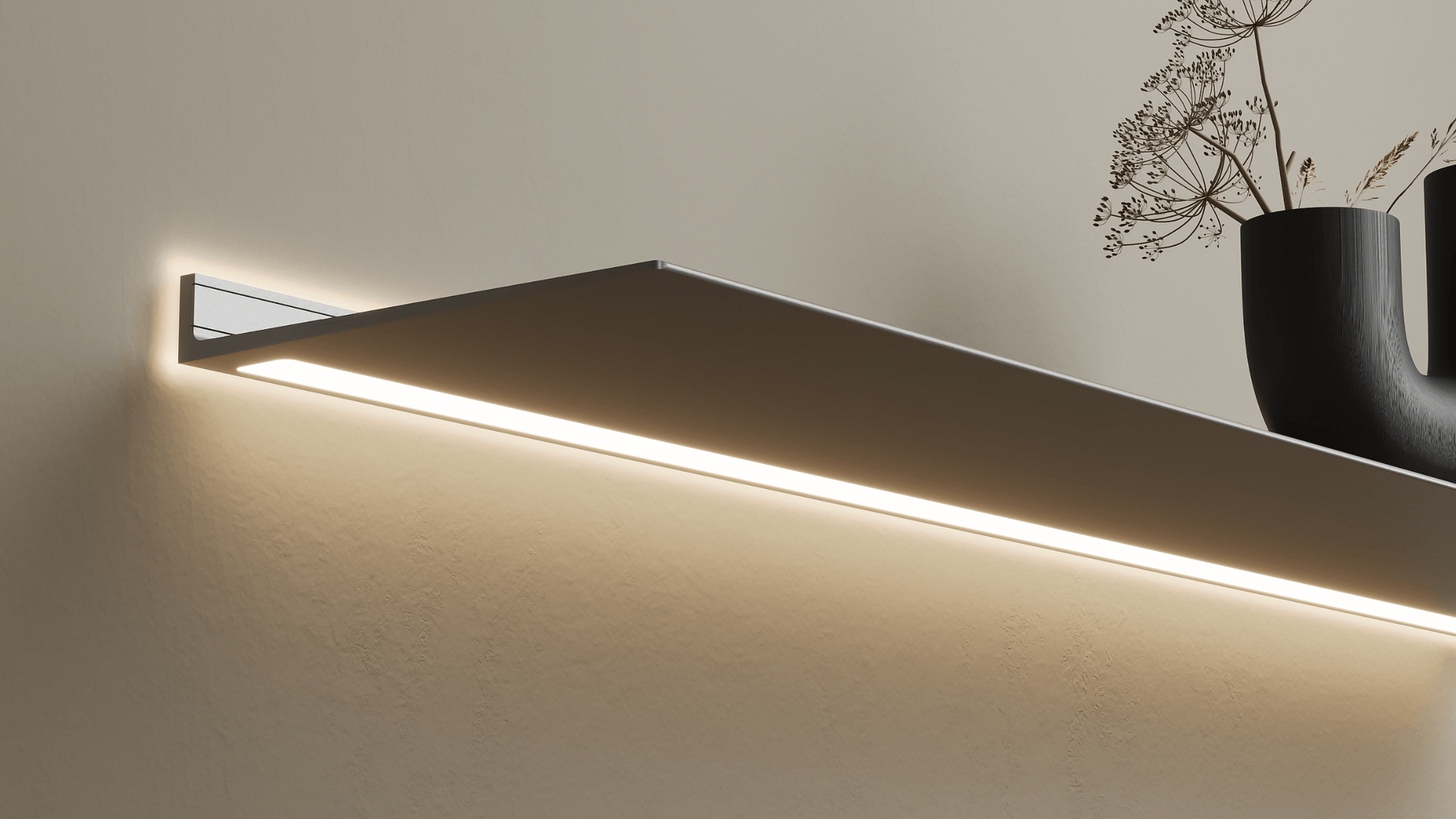 - Geïntegreerde verlichting: LED-verlichting onder de plank zorgt voor een subtiele, sfeervolle verlichting die uw uitgestalde items accentueert zonder overweldigend te zijn. Of zet de verlichting feller en naar witter licht voor werklicht boven uw keukenaanrecht of bureau.