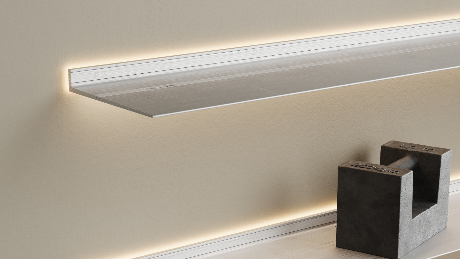 Deze wandplank met verlichting is voorzien van verlichting rondom aan muurzijde. Het diffuse licht aan de achterzijde van de plank zorgt voor subtiele aandacht op de spullen op de plank. De lichtsterkte is dimbaar en de lichtwarmte, de kleur, is in te stellen op elke gewenste wit- of geeltint. De rondom verlichting is mogelijk bij 22 en 29,5 cm diepe planken. Elke plank wordt op maat gemaakt. Wegens de kerst vakantieperiode is de levertijd 8 (ipv 6) weken. De plank is vocht bestendig en roest niet.
