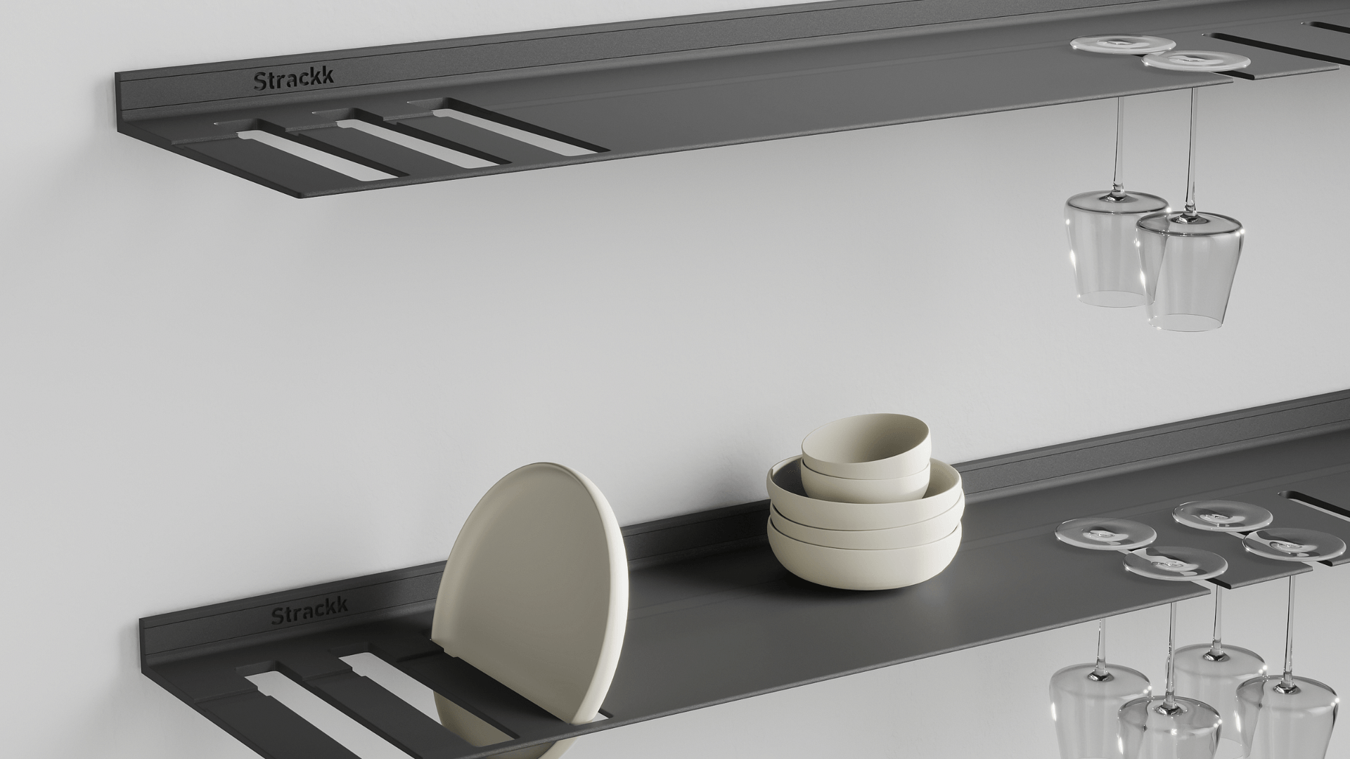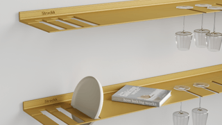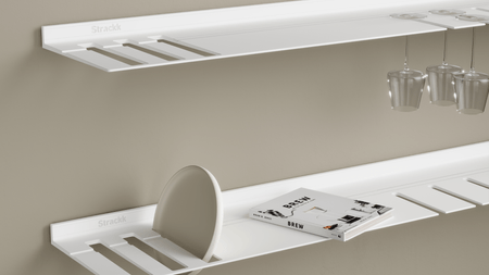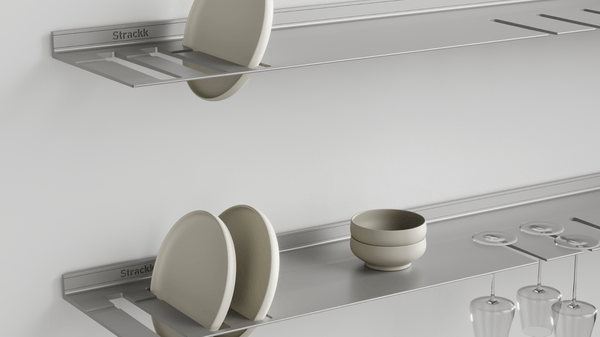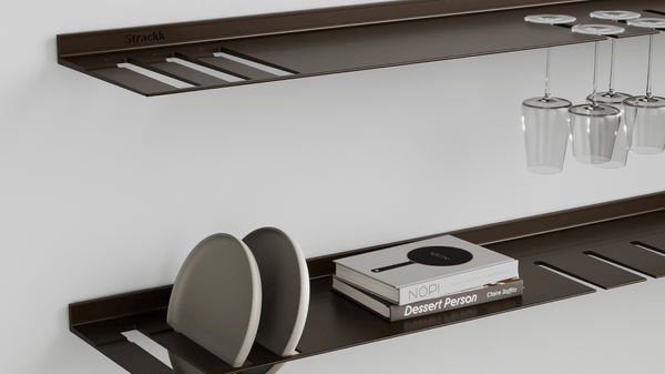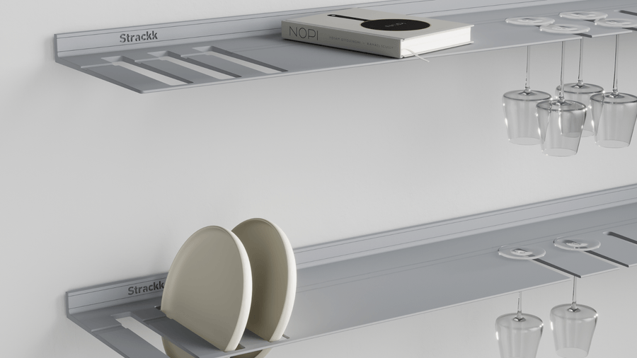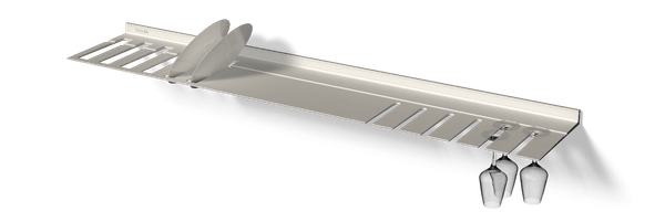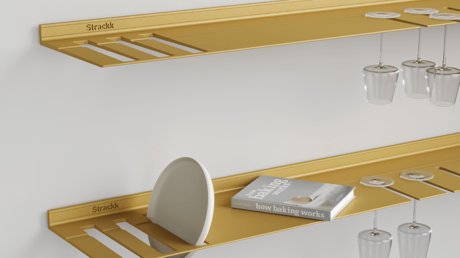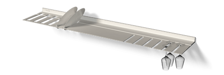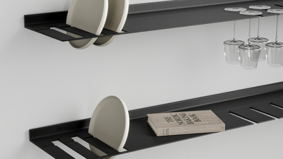 De wandplank met borden- en wijnglazenrek is ideaal voor in de keuken of woonkamer. Zo heeft u uw wijnglazen en borden altijd bij de hand. De zwevende plank is gemaakt uit één stuk gerecycled metaal zodat de plank oersterk is en eeuwig meegaat. U kunt uw mooiste en zwaarste spullen op de plank presenteren daar deze een gewicht tot wel 250 kilogram per meter kan dragen. Voor extra sfeer kunt u in het bestelmenu verlichting rondom toevoegen. Die verlichting is dimbaar van werk naar sfeerlicht.