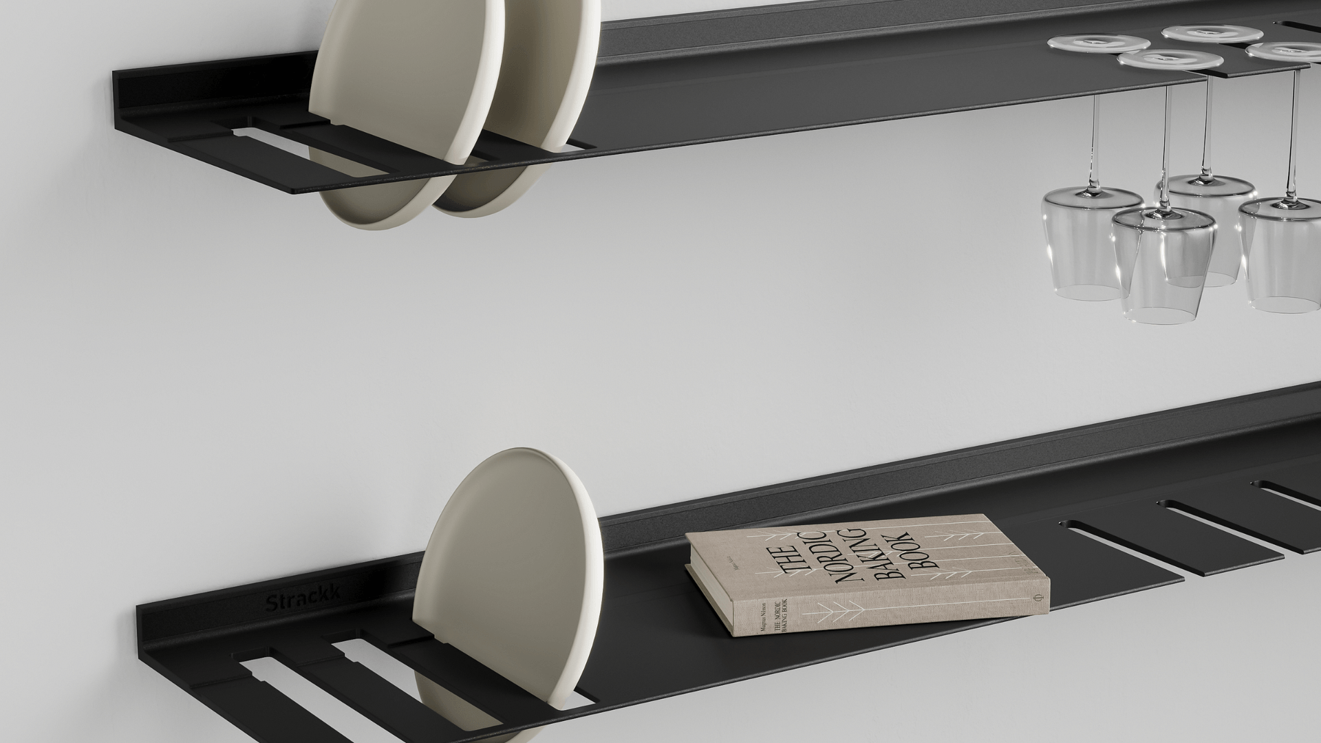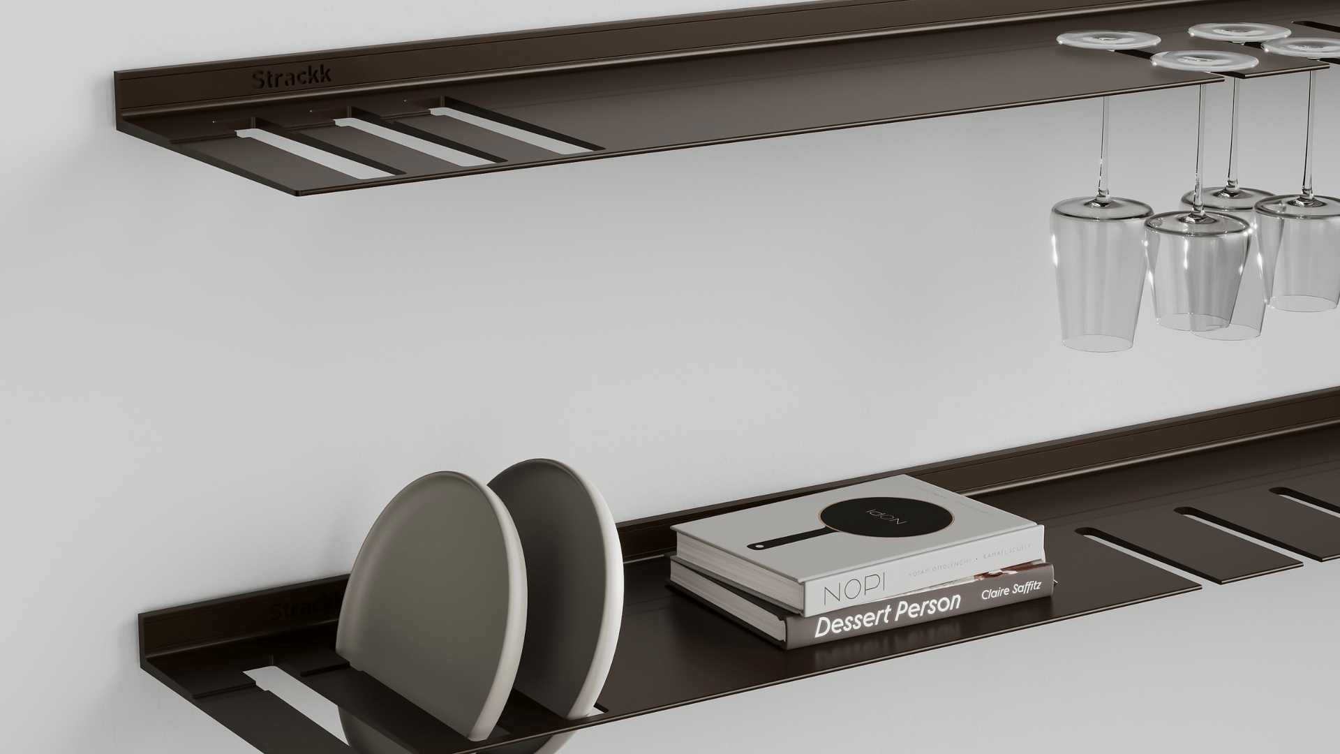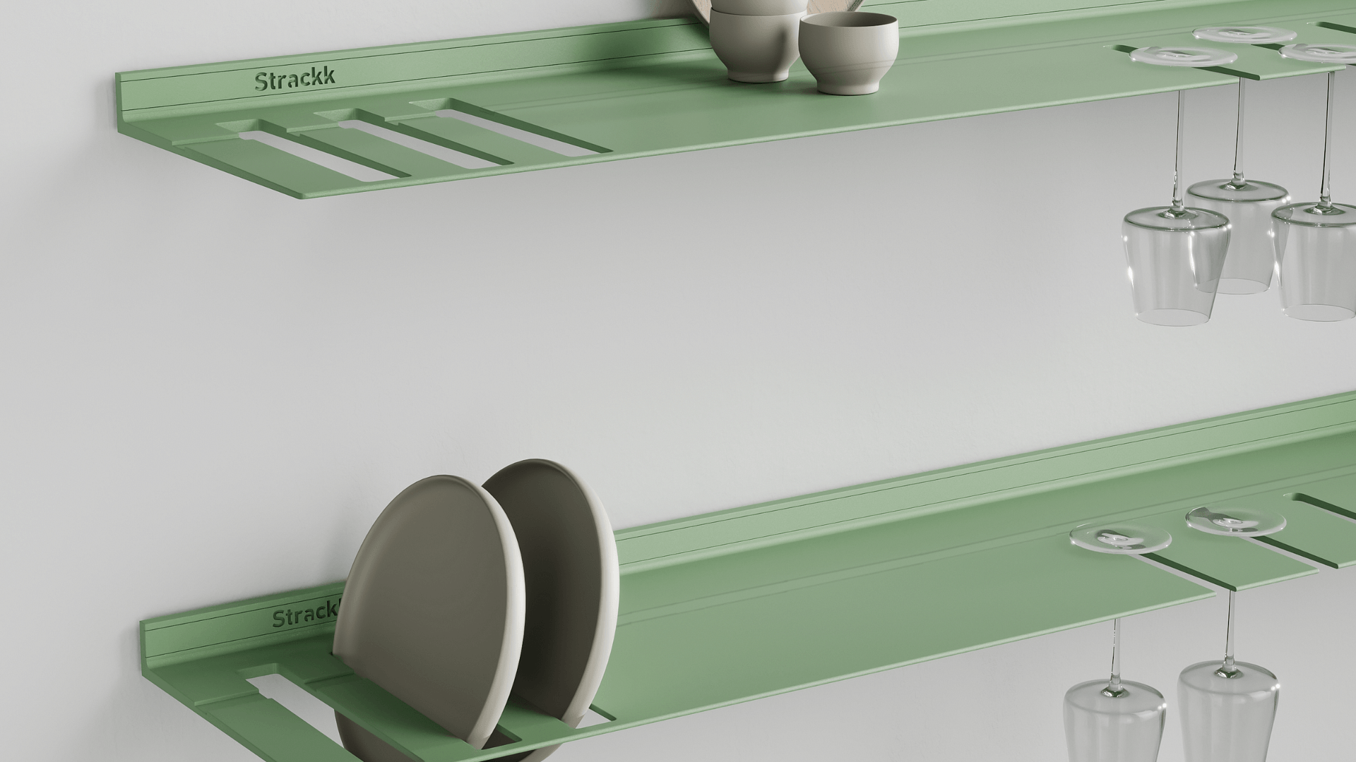 De wandplank met borden- en wijnglazenrek is ideaal voor in de keuken of woonkamer. Zo heeft u uw wijnglazen en borden altijd bij de hand. De zwevende plank is gemaakt uit één stuk gerecycled metaal zodat de plank oersterk is en eeuwig meegaat. U kunt uw mooiste en zwaarste spullen op de plank presenteren daar deze een gewicht tot wel 250 kilogram per meter kan dragen. Voor extra sfeer kunt u in het bestelmenu verlichting rondom toevoegen. Die verlichting is dimbaar van werk naar sfeerlicht.